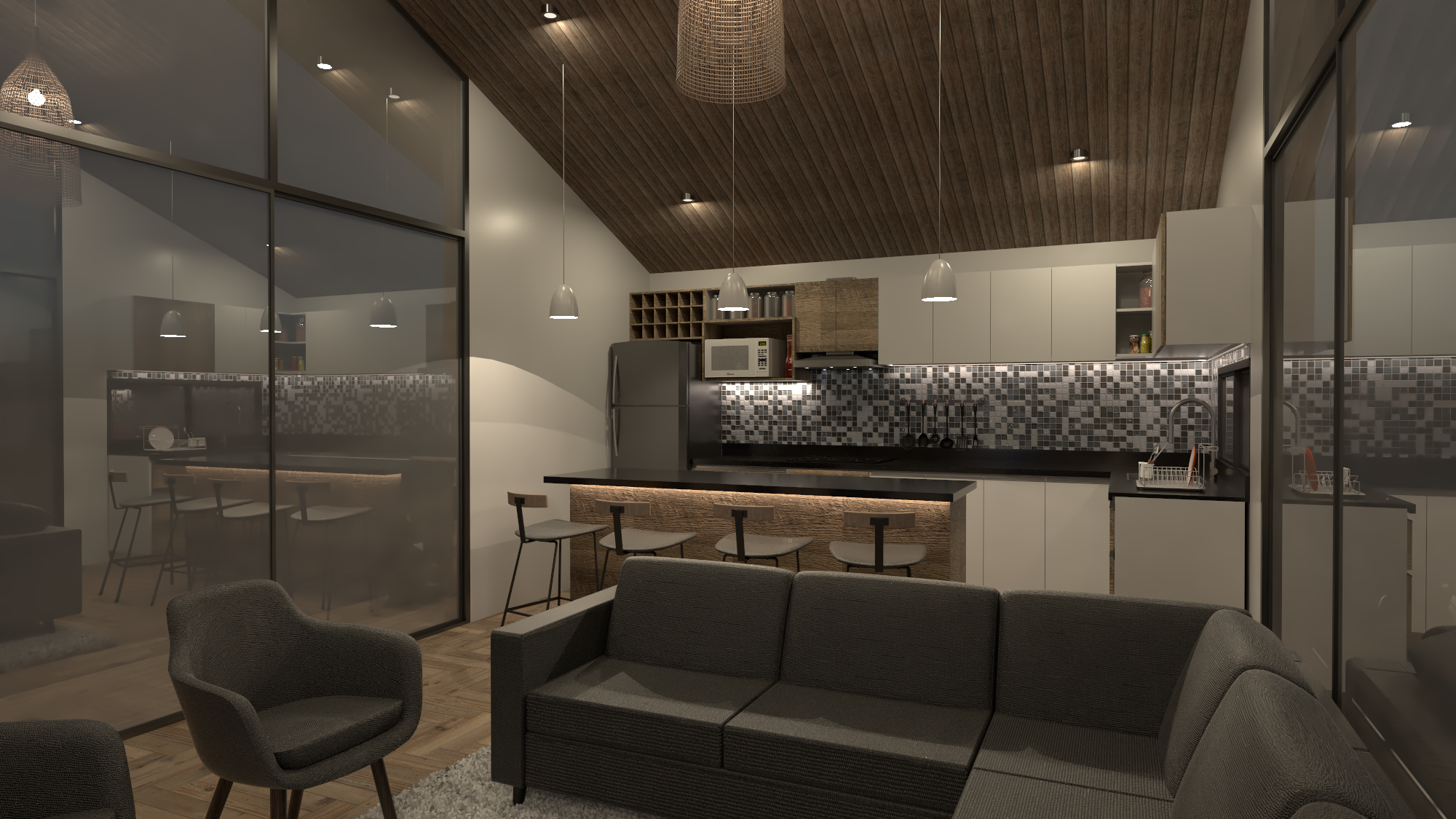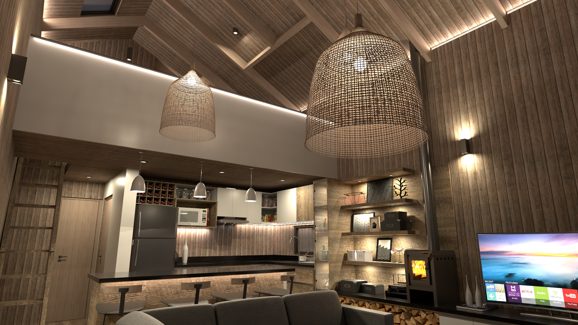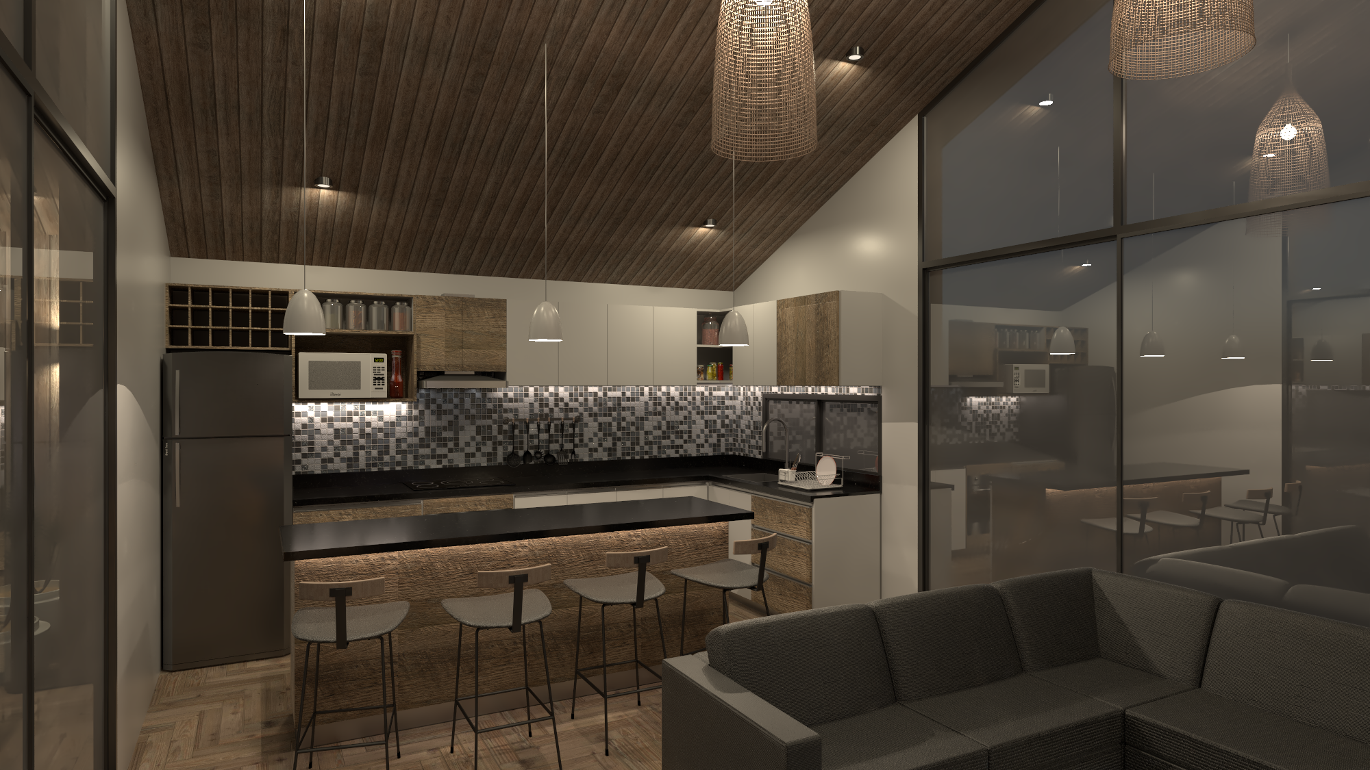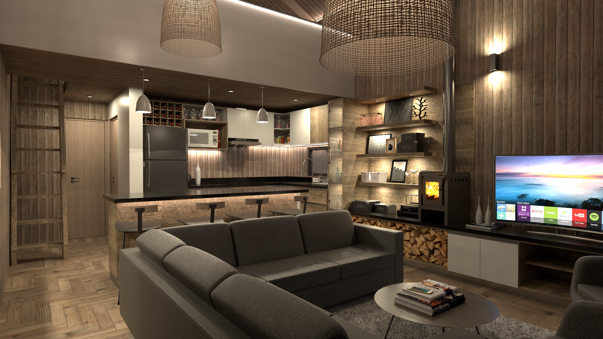 Cabaña Frio nombre inspirado en el Lago Frio de la Patagonia Chilena. Esta espectacular cabaña se caracteriza por espacios cálidos que te harán sentir en casa el programa arquitectónico incluye 1 habitación principal, 1 habitación secundaria dividida en dos niveles, 2 baños, 1 living y 1 cocina